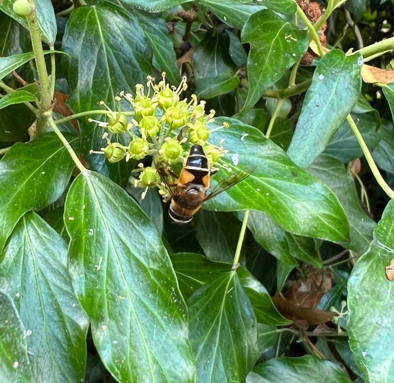 I stepped outside the back door at the weekend and heard a consistent humming. It could have been a distant electrical or mechanical sound but it was coming from the trees. We have sweet chestnut trees covered in ivy. The bees and flies were having a great time, almost every ivy flower had insects feeding. Contrary to common thinking ivy doesn't kill trees, it will bring down dead trees eventually but it simply climbs up the bark to seek light. It cleans the air by capturing air pollutants and provides valuable nectar for insects, especially in autumn. After the flowers come the berries that feed birds through the winter.