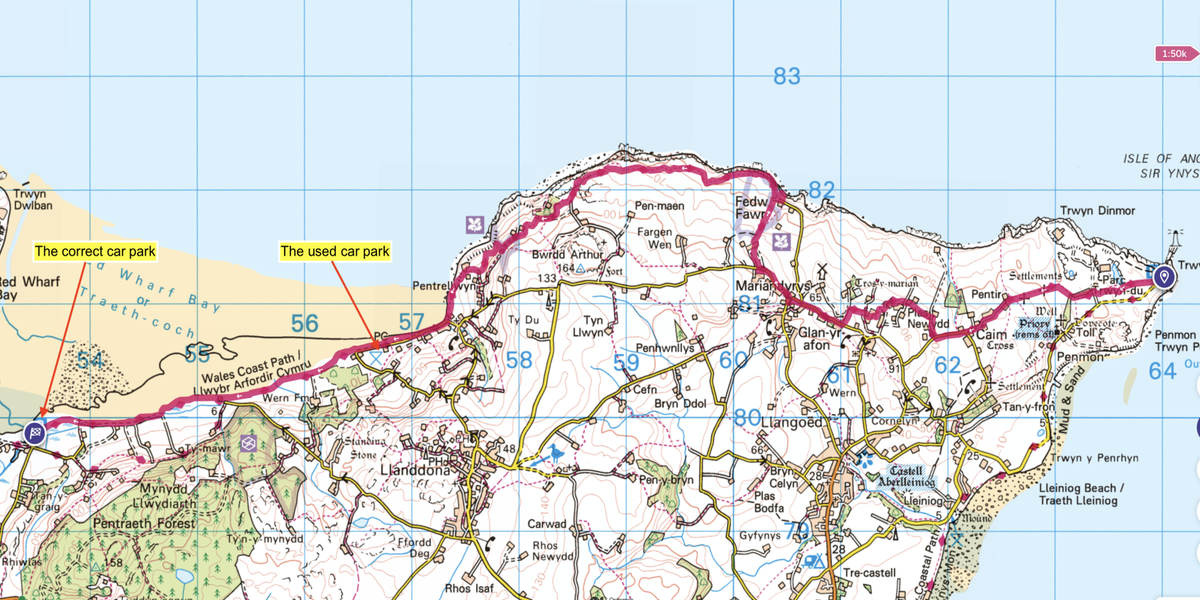 We decided to walk the northern section first, about 68 miles, for no reason than it's the way my brain worked! I plotted the route from Menai Bridge via Beaumaris and Penmon Point then heading west almost to Holyhead. Public transport is not readily accessible so we had to use two cars and leapfrog daily, leaving a car overnight at the starting place which became the next day's ending point. This meant actually walking the whole route section by section in a backwards direction! One advantage of this should have been the prevailing wind would be behind us but we found that wind did not always prevail!