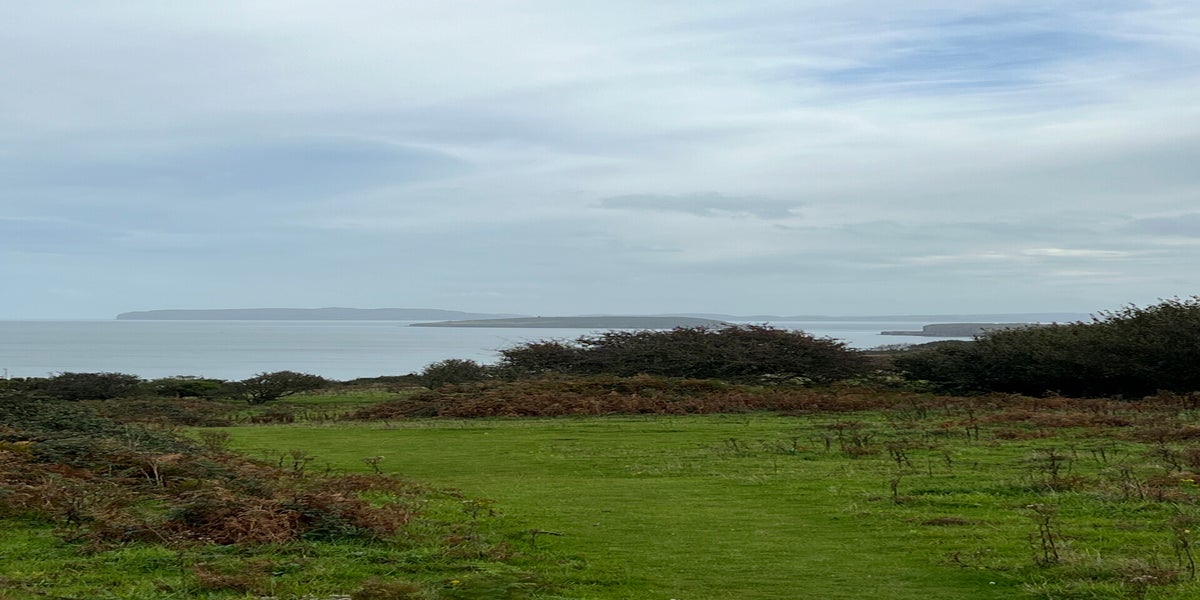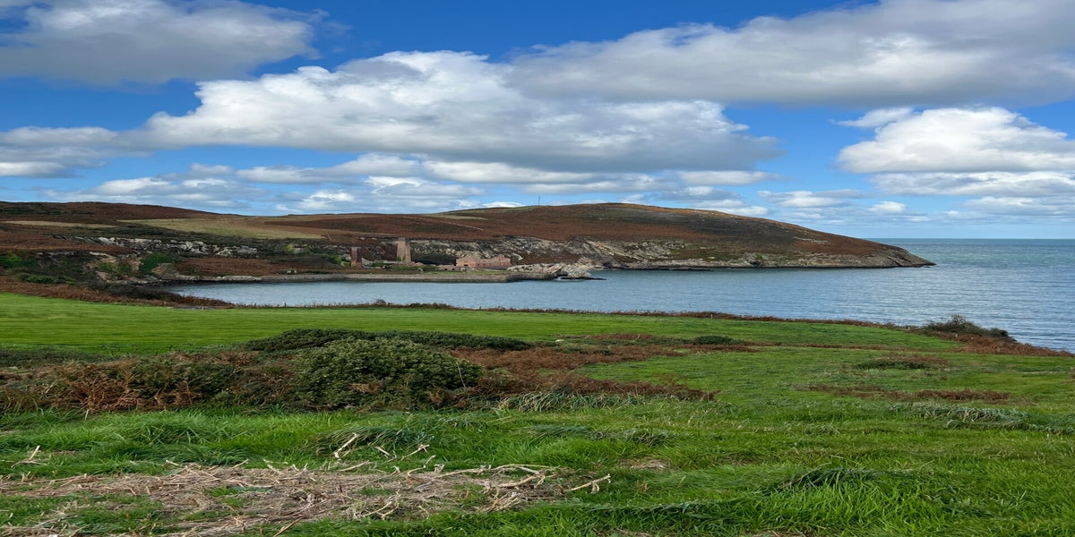 I should admit it here that I had planned and mapped 5 days of walking before we realised it was going to be 6 days! The final day, hastily planned, in lovely weather was again about 11.5 miles. We started near LLanfwrog at Penryhn, reaching a beautiful beach with just a handful of users. We had lovely views of Holyhead, Holy Island across the Holyhead Bay. The first part of the walk was reasonably flat but the middle section became a bit more challenging. We encountered many more seals in this section with the pups sporting their white fur. Ravens had been heard and seen all the days of the walk but on this day they were outdone by the red-legged Choughs. Small parties of these spectacular birds popped up from rocky cliffs and it's clear from signage that efforts to increase the population are real and working. Out in the bay is The Skerries lighthouse gleaming in the sun. As we finished our walk on undulating fields we could view Wylfa across the bay and several old structures for which I've yet to establish a purpose.