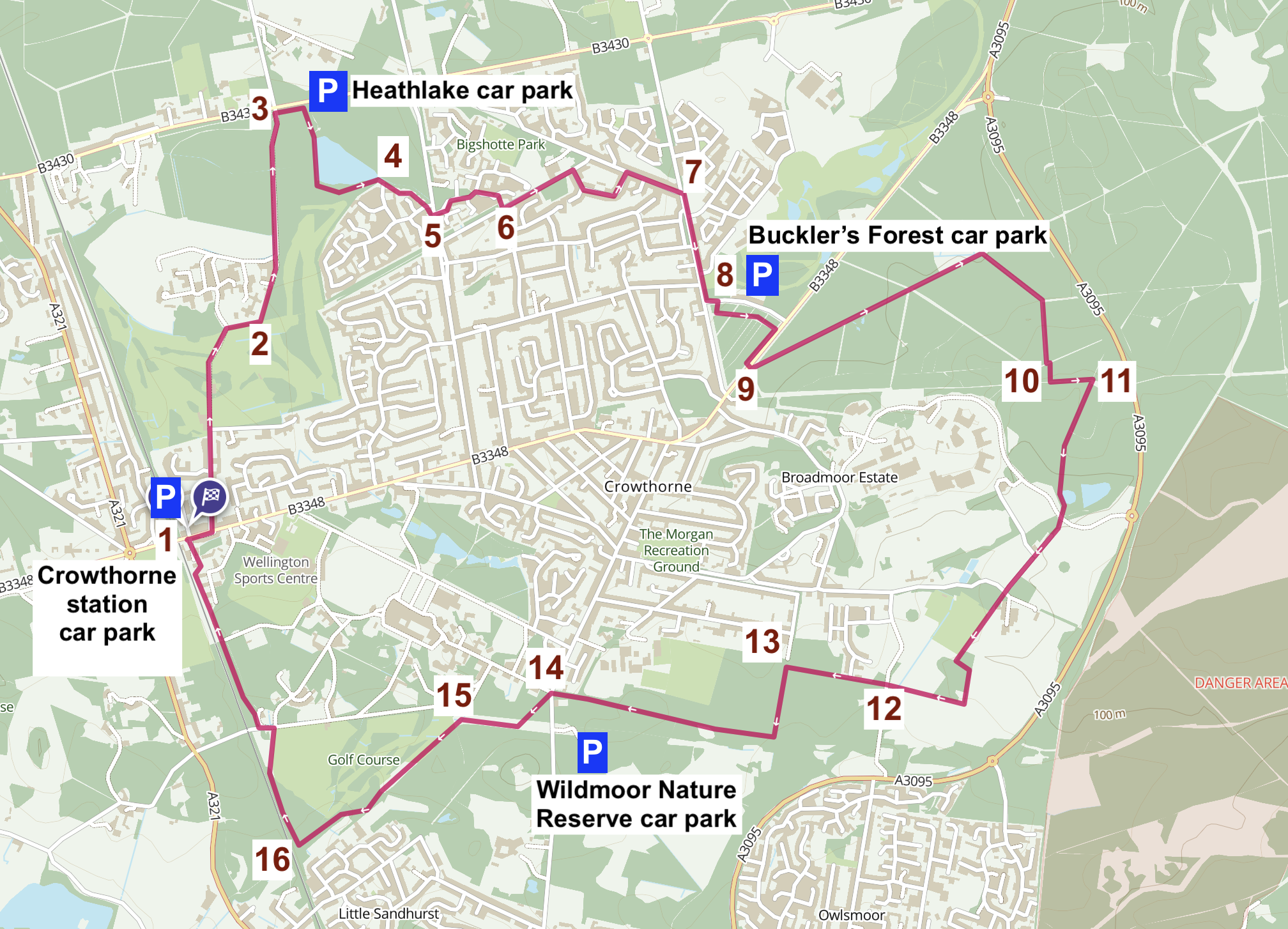 A varied walk with a local nature reserve, golf course, mixed woodland, heathland areas and fields around Crowthorne. See the map for parking choices.