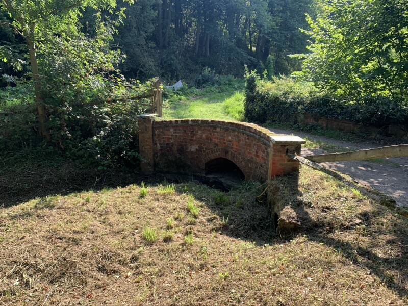 Continue along this quiet lane soon bending sharply to the left and ignoring the footpath signs. This now slopes downhill in a lovely setting right down to a bridge over what I guess to be a stream at times although I have not seen water in it yet! The lane turns right but we now take a footpath through a kiss gate on the left of the bend in front of us. This nice sheltered path follows the hedgerow until you see a stile in front of you. You can step over this and carry on in the same direction or follow the path to the left, they both end up joining a lane. You pass a nice little bridge on your left, again the stream has always been dry on my visits!