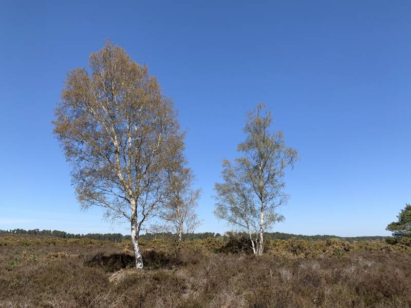 Take the main track to your left. This opens out with heath on both sides and will be a lovely sight when the heather flowers in the summer months. Stay on this main track ignoring any smaller paths or tracks leading off it. Watch for silver-studded blue butterflies. It bends around to the right and carries on to a crossroads, the cross track is a yellow sand. Cross straight over on white sand and continue until a small block of trees appears on the right-hand side of the track. Take the path skirting the right-hand side of the trees and turn right up the slope towards the top of the hill. Linnets are common here in the yellow gorse bushes where they nest in the summer. When you reach the top of the hill many tracks merge. You will see a bench opposite, if it’s free take a breather for a minute or two to check the view, it’s wonderful. To the right of the bench you can now see your path dropping down the hill. (Effectively, this is crossing straight over from the path up the hill).