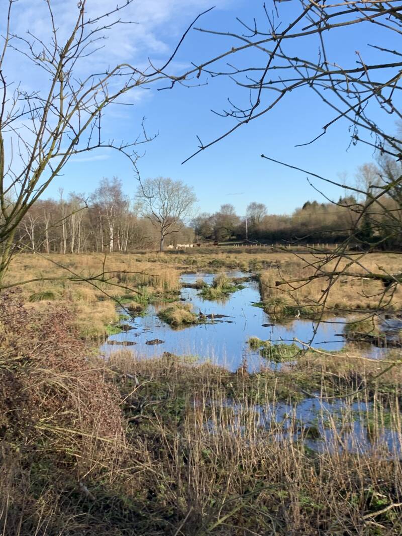 Depending on the time of year you will find many birds, butterflies and plants like sedges and rushes here. Look for the purple southern marsh orchids that flower in May, June and July and purple loosestrife in June to August which is a major nectar source for brimstone butterflies, red-tailed bumblebees and elephant hawk moths. Yellow loosestrife is found here as well flowering June to September and may attract the yellow loosestrife bee. There is a lot of wet woodland with alder being the predominant tree and some nice deformed oaks as well. A conservation herd of cattle is often on the reserve and they are often near the fen, the wet area where springs feed pools surrounded by reeds and which hold species of duck and occasional geese in the winter. Keep going all the way along the reserve enjoying the nature until you pass a place where cut trees are stored on your right and the path turns right down to a gate and a T junction. Turn right here.