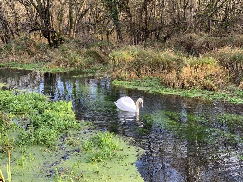 This next stretch is very beautiful with the marsh on your right with its birds and aquatic plants and the river and wide waters of the Whitewater on your left. Behind the waters you will see phragmites reedbed and should hear reed warblers and reed buntings in the summer. Sparrowhawks are likely to be seen above you and in March they may be displaying high in the sky, often you may be attracted to them by the sound of crows, rooks or jackdaws challenging them. Working along the path you will soon see the picturesque mill, worth a photo! Pass the mill and turn right along the riverbank. This lovely stretch is a real chalk stream with clear waters, watercress and possibly even a kingfisher perched over the water looking for a fish. Part of the path is a boardwalk. Eventually, the path reaches St Mary’s churchyard a pretty spot with yew trees and the porch is maybe, somewhere to sit and eat some lunch. There is a single Commonwealth war grave here.