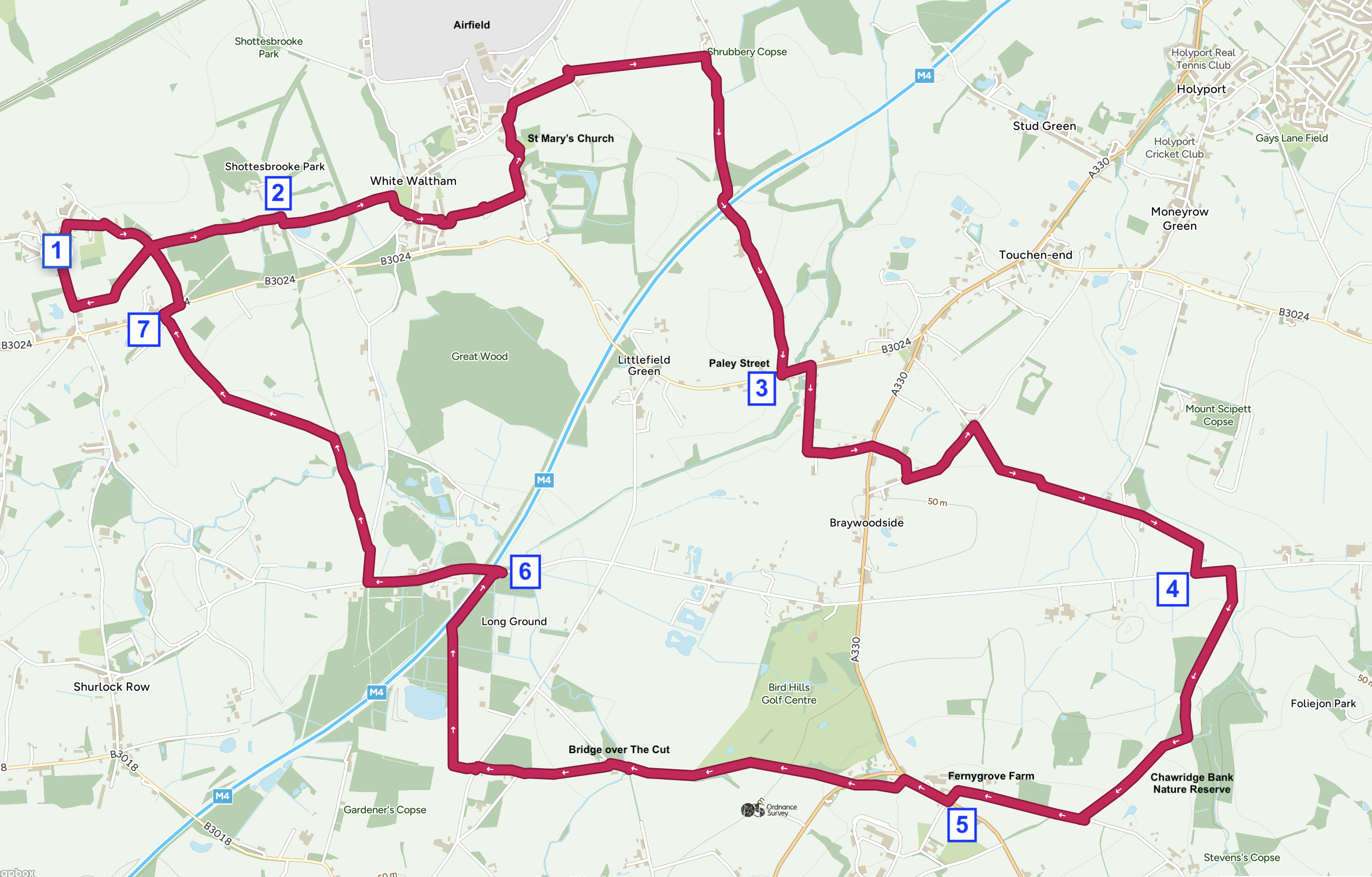 - Cross the road and turn left on the roadside path. in a few steps you will find a bench to rest on and a bridge over The Cut river, a Thames tributary. Continue on your walk turning right into Sheepcote Lane. Walk the entire length of this lane which contains a sharp left bend. Reach the main road and cross carefully to the footpath opposite. Follow the path around to the right until you meet a tarmac access track and you face metal gates with various warnings. Turn left onto the public bridleway. Keep going along this lovely tree lined track passing two huge concrete blocks. You reach some farm buildings and public footpath signs Take the one through the gate to your right. This path gently curves right and up to the treeline. At the Hedgerow go through the gate and turn left along the field edge continuing into the next field keeping on the same field edge. On reaching the track cross straight over and through the gate with the container on your right. The path follows the track to the next hedgerow and then the path is slightly to the left of the fence across the next field. Through the next hedgerow with a double gate. The path goes straight across what is sometimes a ploughed field but usually a path has been marked out. There are two large trees quite close together to aim for and a footpath post if your eyesight is good. At the footpath sign turn right to the road.