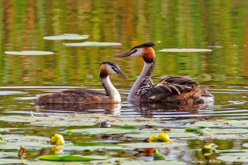 Follow this path down the side of the pool. On the way you can expect to see a variety of water birds, in winter there are hundreds of ducks such as Gadwall, Wigeon, Teal and Tufted Duck. Great Crested Grebes can be seen sometimes carrying young on their backs in summer. Mute Swans are ever present. Cormorants use the overhead wires to perch. Herons are often hiding in the reeds and bushes. The reeds also hold Reed Warblers in summer. This whole area is full of wildlife.