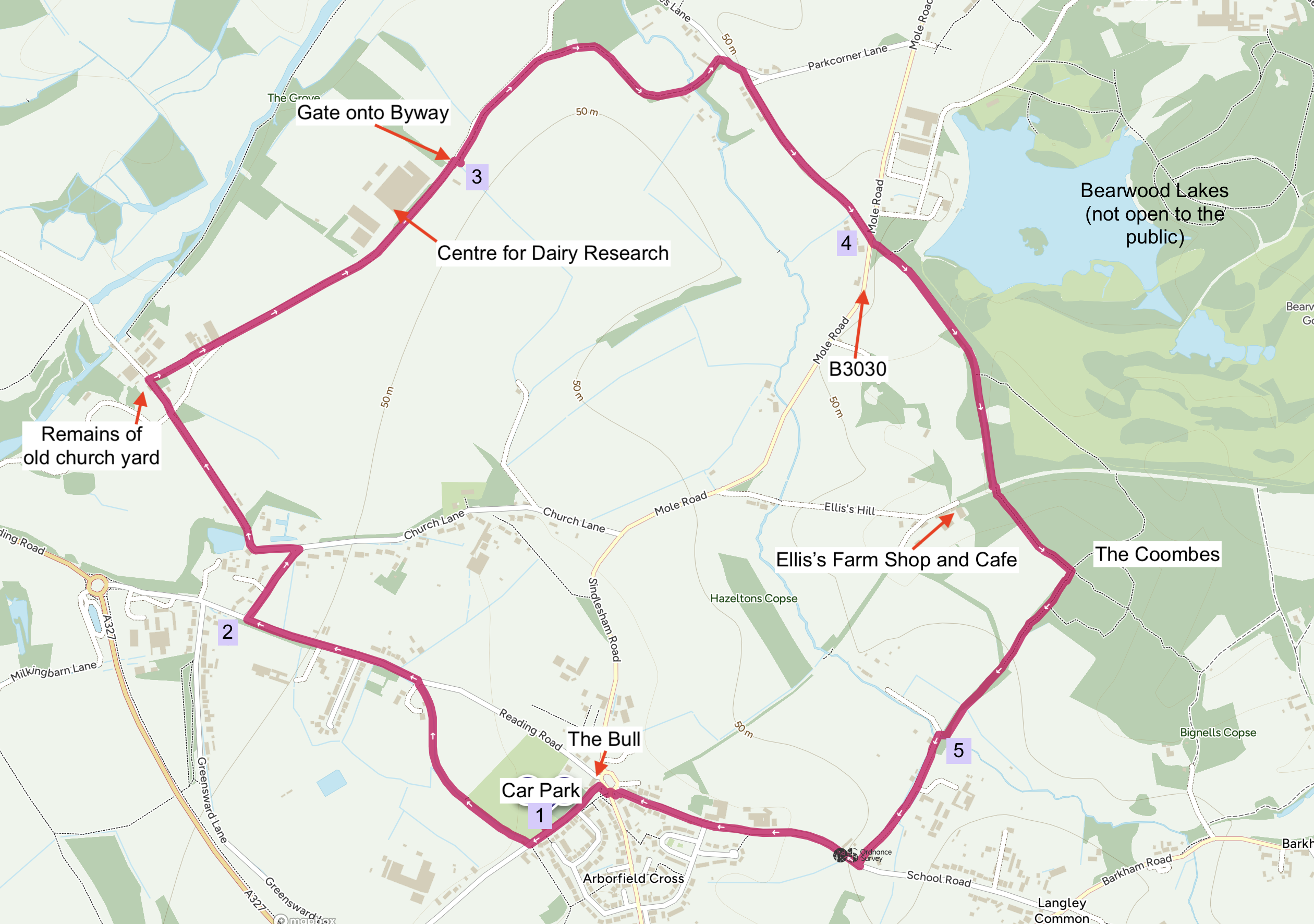 - Start at the Recreation Ground car park, Swallowfield Road, Arborfield Cross near The Bull pub. Cross the football pitches to the far-left corner. Cross the footbridge and turn right on the footpath. At the road turn left along the tarmac roadside path until you see Church lane on the right.