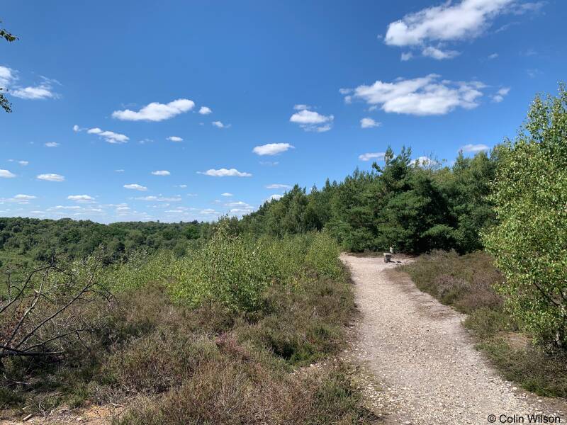 After a hundred metres or so you will see the gate to Castle Bottom to your left. Go through the gate, pass or sit on the bench and admire the beautiful view in all seasons. The path leads downhill, a bit steep and slippy for a few metres before you get to wooden steps. There are different types of heather here. Cross-leaved Heath and Common Ling are easy to find, Bell Heather is also present at Castle Bottom. At the bottom of the hill is a small stream and a place to rest and enjoy the views.