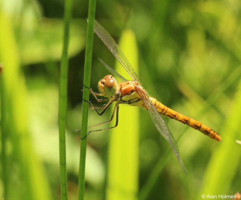 The Reserve is famous for dragonflies and many may be seen here. Next, cross the bridge and climb the hill again. Numerous Grayling butterflies are found on the edges of the tracks in summer. Keep going on the same path bending slightly right as you climb.