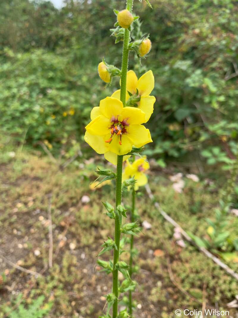 Assuming no exploration you should cross to the old runway ahead of you and walk towards the airfield. About a third of the way along turn left onto the grass of the Common. Turn right and enjoy the plants, birds like Whitethroat and Linnets until you reach the next old runway. Head right and at the next tarmac turn left and head for the end. Go right up to the airfield edge and turn left along a narrow path. This leads you back to the earth bumps you crossed earlier. Turn right before them along a path and when you meet a path cross roads with an old oak tree in front of you turn right.