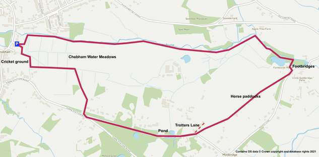 Start your walk at the Chobham Village car park (free for one hour only, you may need two, but you must get a ticket). Nearest postcode GU24 8LZ. Exit the car park at the back end and turn right.