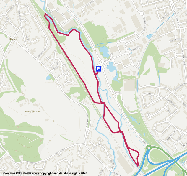 Park at the car park just off the A331 opposite Watchmoor Park Business Park. In spring Blackcaps, Whitethroats and Chiffchaffs will be singing here. Cross the river via the footbridge and turn right. The river is quite lush here and pretty. In summer, Banded Demoiselles are common and flowers like Orange Balsam (common jewelweed) are on the river bank. Often, when its quiet, a Grey Heron will be seen and some Mute Swans, Moorhens also like it here. You pass some Grey Willow on the left before the tall Black Poplars that are quite a feature of the Meadows. There is a lovely view of the clear river and gravel floor soon. Walk on past the end of the hedgerow keeping right on the path staying on the riverbank, not following the path to the left crossing the meadow via the bench. You will soon reach a shady corner where some trees have fallen in the river. Right at the furthest point there is the inflow from Camberley Sewage Works. This is a favoured place for Grey Wagtails that like the tumbling water and the insects that thrive there. Watch for their bobbing tails and undulating flight just above the water or on the banks or concrete plinths.