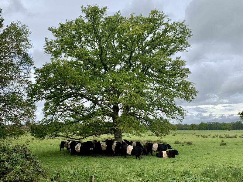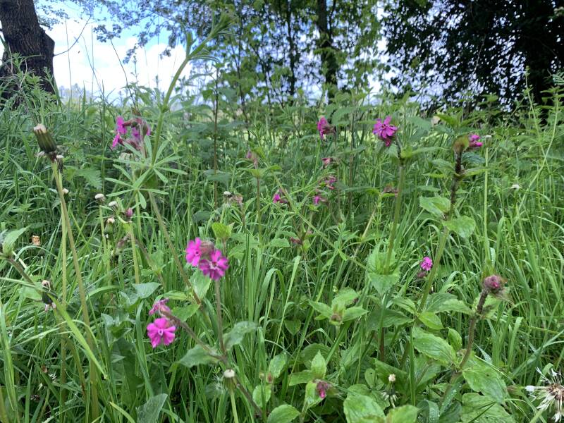 The paths reach a point at the end of the heath where you see a water trough for the cattle. Turn 45 degrees left on the widest path into the trees and follow this path left again where it meets another from the right, through the mixed woodland. Cross a small stream and sleeper footbridge and where the path splits take the right-hand option – this is signposted as a footpath – ignore the permissive bridleway. Great Spotted Woodpeckers should be found here. Keep going across two footpath crossroads until you reach some new gates at the end of the woodland and an archery field to the right. Go through the new gates and this takes you along a pleasant stretch of land with hedgerows and open areas for wild flowers like red campion, greater celandine, forget-me-nots and lots of cow parsley. At the time of writing after a cold wet spell, I have yet to find butterflies here but undoubtedly will when the sun shines! Over on the right, not on your path, at the end of the row of trees in front of you, is a superb old oak tree, probably about 500 years old! If you go to see it return to the same path you were on and follow it as it passes through the gap at the left end of the row of trees. The path narrows with a ditch on the left with lots of wild flowers in spring. You emerge onto a concrete track and turn left to the road. Cross to the footpath and turn right.