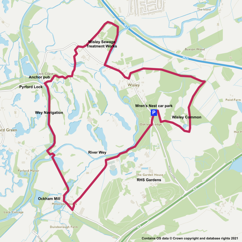 Start this walk at the Wren’s Nest car park on Wisley Lane on the opposite side to the RHS Gardens car parks. Nearest postcode GU23 6QD.