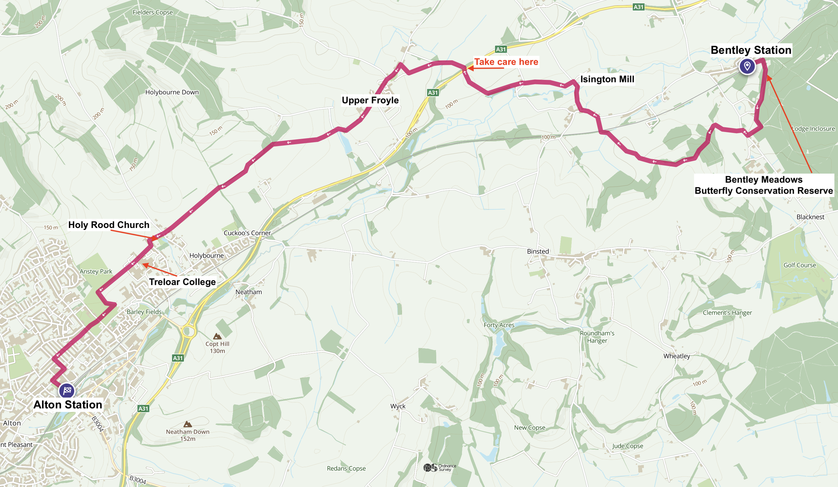 - This is the A31, a very fast road. Cross it by crossing the first side of the dual carriageway and turning right on the grass to the end of the metal barrier. Cross the second part of the dual carriageway to a lane on the other side. Follow that lane. (Late in 2023 you will pass the reinstatement of the land used for the Southampton to London oil pipeline.) The lane splits and take the left-hand side into Froyle Park. You are now on the St Swithin's Way and we will follow this signposted path into Alton. At the 5 mph sign, where footpaths cross, turn right across the field until you reach the lane.