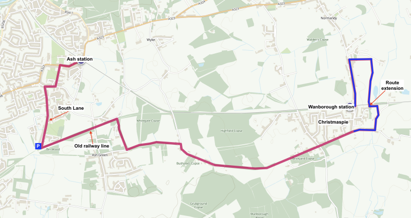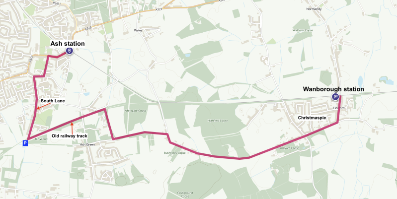 Start from Ash station or, if travelling by car from the free car park at the very bottom of South Lane (plenty of parking in the lane). The step by step guidance below includes both starting points and an optional walk extension.