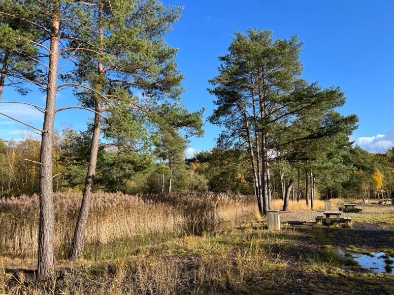 Reach a T junction with a bench in front of you and turn left and then left again on a strong made-up path. This mixed woodland is well used and has many paths and tracks, but remain on the main path in front of you. On your left through the trees, you may see another area of fairly open ground worth a little exploration to look for wildlife. Keep your bearings and return to the main path still going in the same direction. In November, there’s plenty of fungus to search for. You’ll pass a colourful signboard with suggestions of some of the nature you may find through the woodland. Continue on this path until a second signboard on your right-hand side. Continue around the left-hand bend and you will soon see a path on your right marked by various Silverbirch logs which exits the woodland. Reach the tarmac path and turn right, stay on the same tarmac and skirt the roundabout taking the road to the right. After, just a few yards, on your left, you’ll find a path alongside metal gates, leading into Hartland Country Park. The noticeboard tells you of some of its nature attractions. I recommend sticking to the main footpath through the park. At the main footpath junction turn right towards Butterfly Bank avoiding Hartland Village. After a nice wooded section with some heather, you soon see the pond area and stands of reed over to the right and the area is set out as a picnic place and worth a visit. I understand it is very good for dragonflies in this area. The butterfly bank has been created the other side of the pond. Returning to the main path follow it with the noticeboard on your right-hand side all the way to the car park.