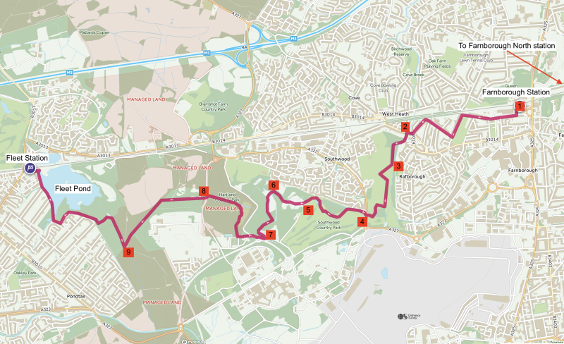 Outside Farnborough station, turn right and follow the road to the traffic lights at Prospect Road and turn left. When you reach the end of the tennis courts turn right into Holly Road. When you reach Highfield Road, take the footpath directly in front of you to the right of the house. Continue to the very end of the next road and turn right.