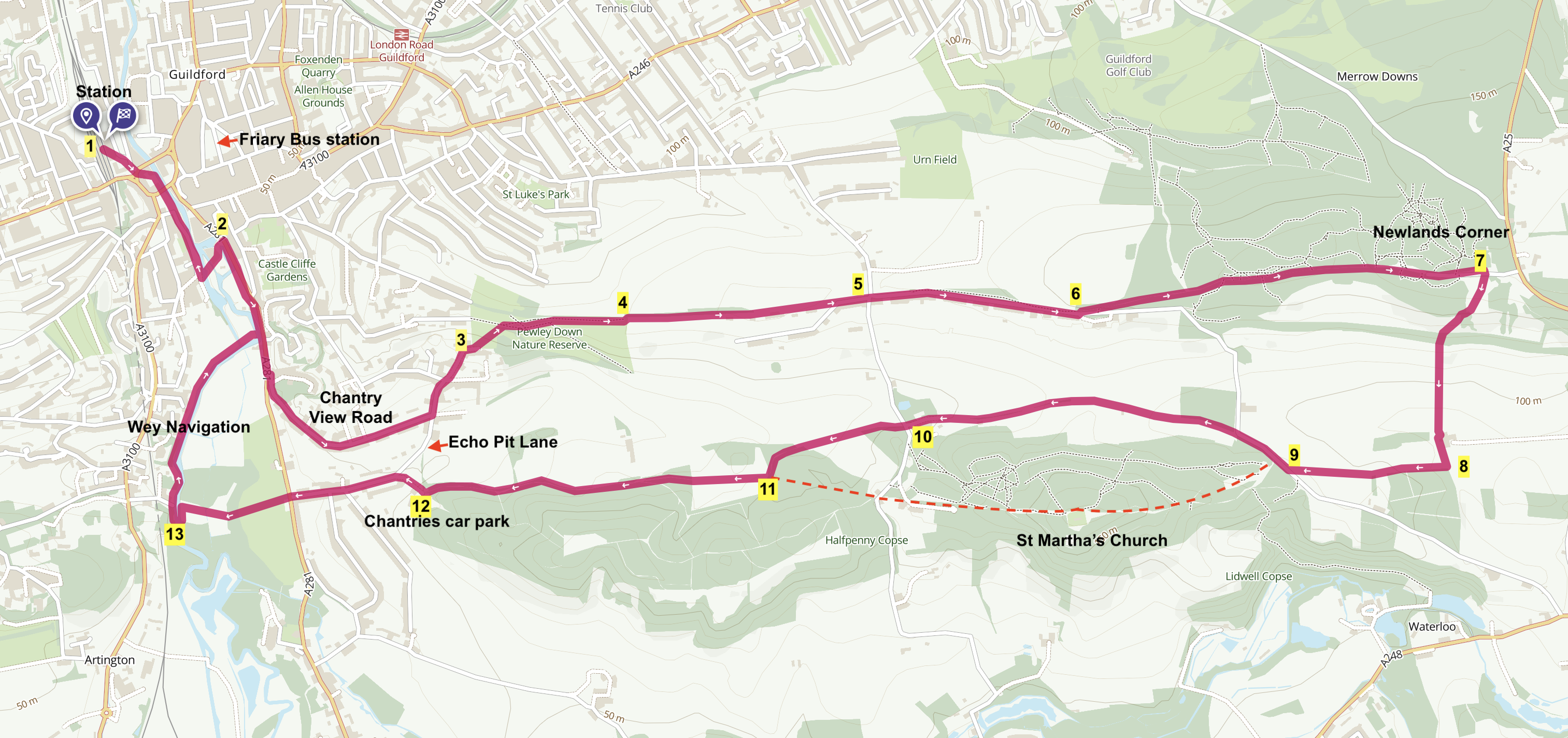 The 8.7 mile walk is from, and returning to Guildford railway station. Most local stations connect to Guildford. Bus users can also start from the Friary Bus station, dropping down the hill towards the closed Debenhams Store and turning left onto Millbrook picking up the instructions at Step 2. The walk has a few hills but deserves a moderate rating as most is along the flat.